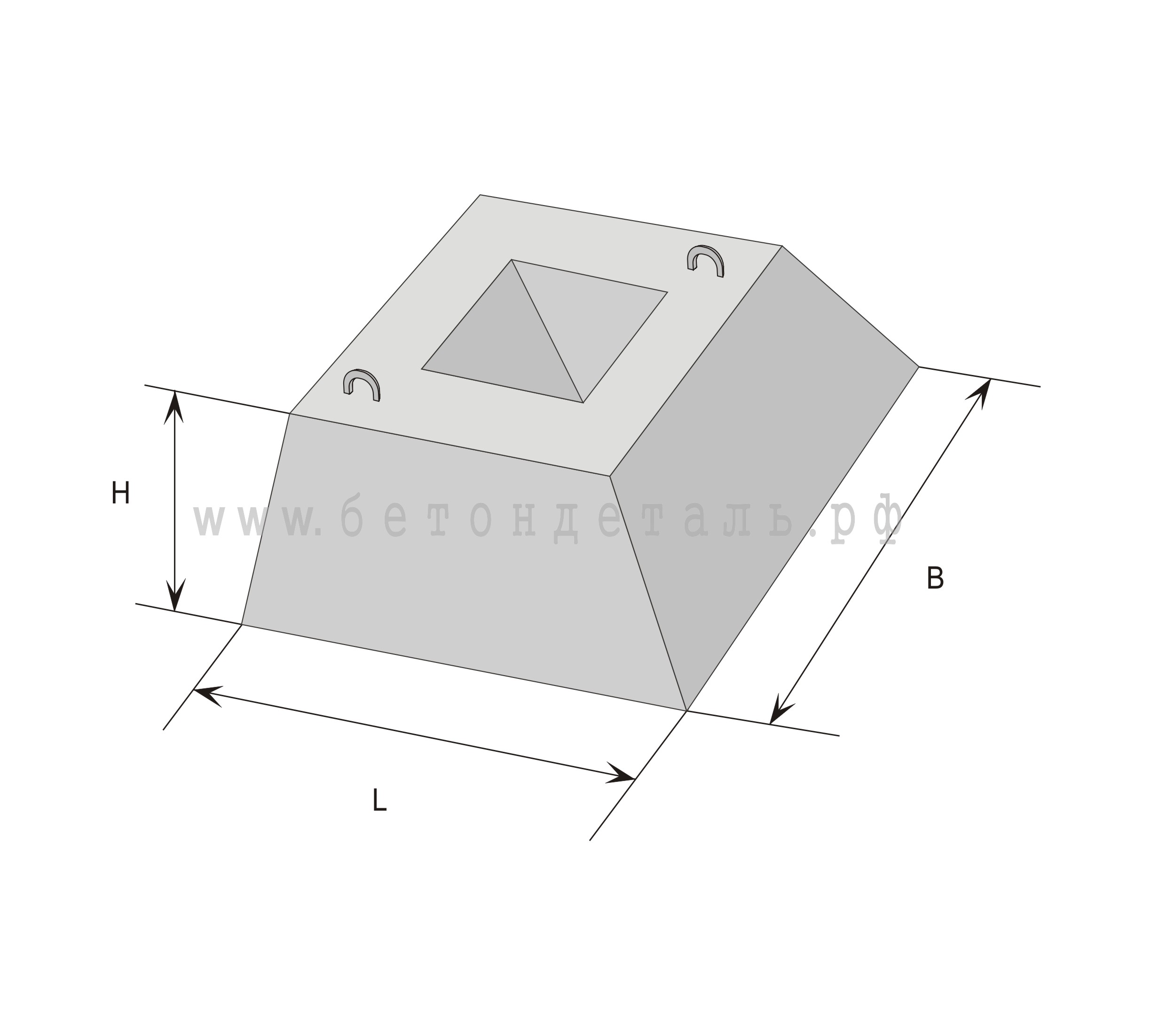 Бетонные блоки изготавливают из высокопрочного тяжелого бетона (М200). Морозостойкость тяжелого бетона должна быть не менее F50. Для придания бетонным блокам еще большей прочности и жесткости конструкция армируется. Армирование выполняется с использованием специальных сварных сеток и объемных каркасов, которые изготавливаются из стали и проволоки высокого класса (класс стали АIII, класс проволоки ВI). Использование в конструкции бетонных блоков данного вида армирования, позволяет распределять и передавать нагрузки от тяжелой железобетонной плиты забора на грунт. Кроме всего прочего в бетон вводятся специальные добавки, которые повышают его водонепроницаемость и стойкость к агрессивному воздействию окружающей среды. Для удобства проведения погрузочно-разгрузочных работ и монтажа изделия, конструкцией блоков предусмотрено наличие специальных монтажных петель. Масса сборного фундамента из тяжелого бетона 2100 кг .