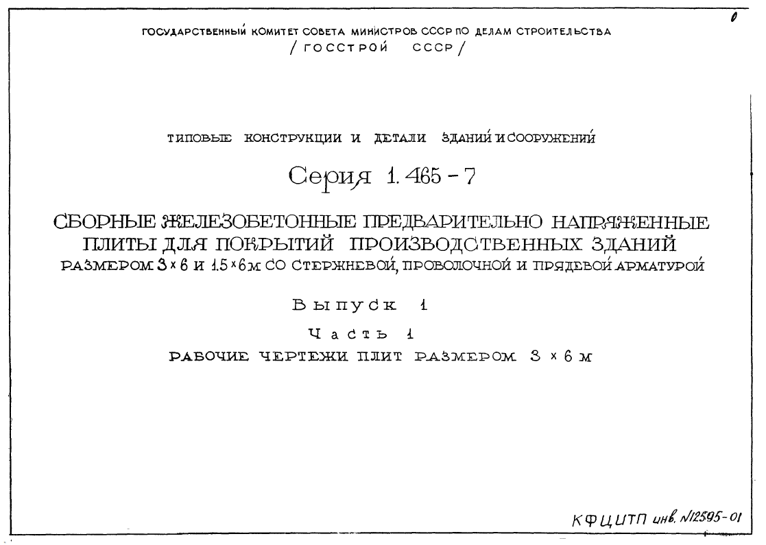 Серия 1.465-7 Сборные железобетонные предварительно напряженные плиты для покрытий производственных зданий размером 3х6 и 1,5х6 м со стержневой, проволочной и прядевой арматурой.