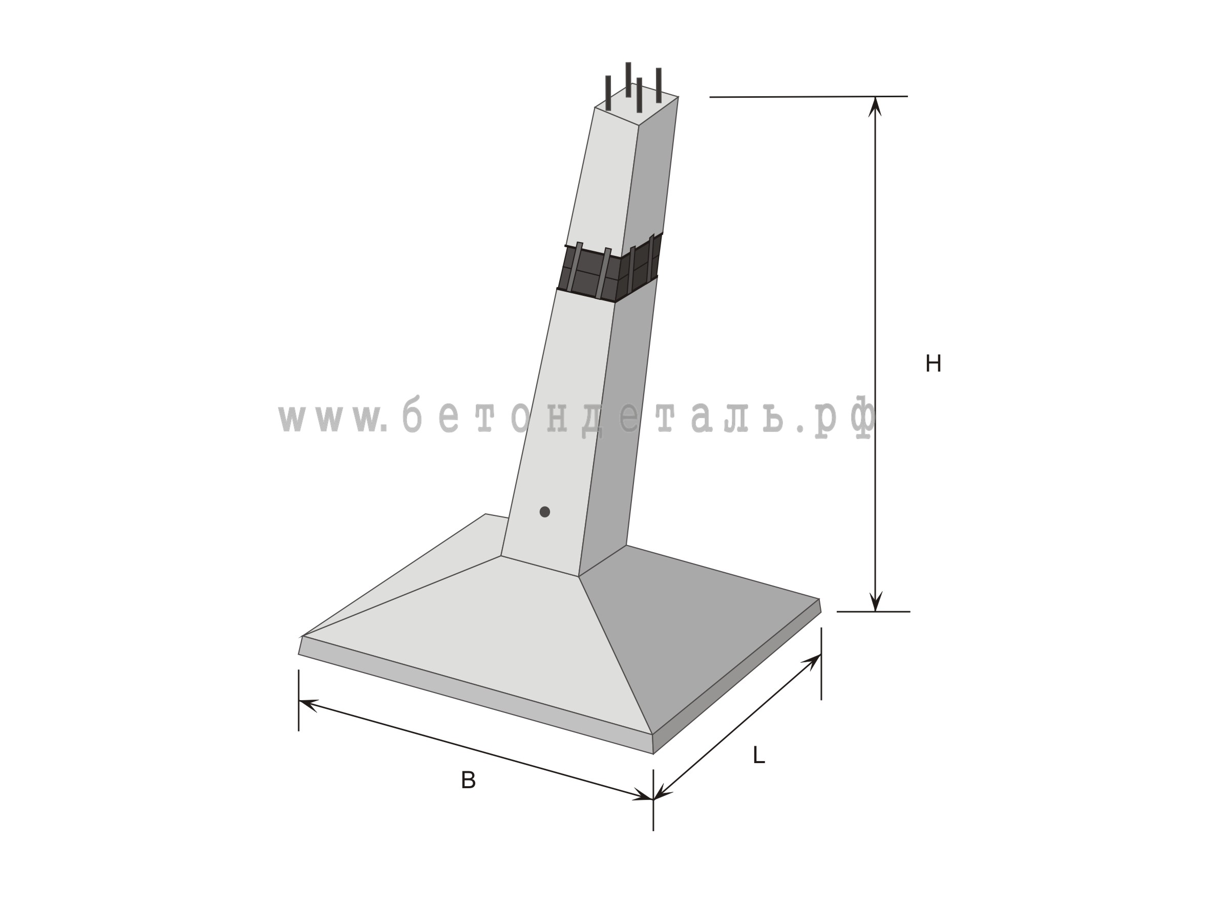 Фундаменты укороченные ФПС 5 А5 предназначены для металлических анкерно-угловых опор ЛЭП напряжением Вл 500 кВ. Это монолитная конструкция, по своей форме напоминающая форму перевернутого гриба. Наличие наклонной стойки облегчает нагрузки на фундамент. Подножники используются в таких сложных местах, где требуется высокая стойка: берега рек, болот, озер, косогоры оврагов.